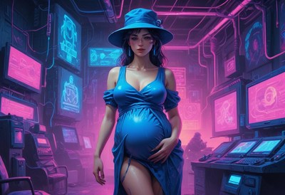 Pregnant woman in blue dress exploring a tech lab