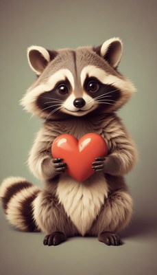 Raccoon holds a red heart in a charming pose