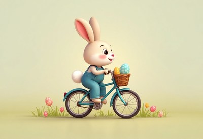 Cute rabbit riding bicycle with easter eggs in basket