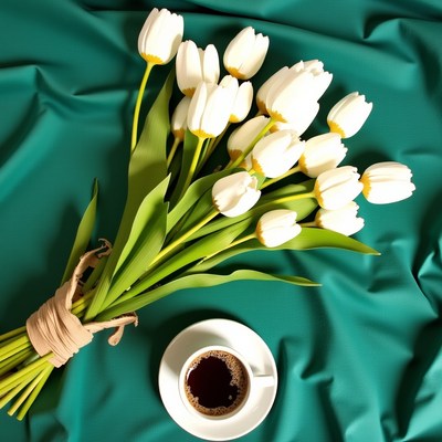 Elegant bouquet of tulips with coffee on a teal backdrop