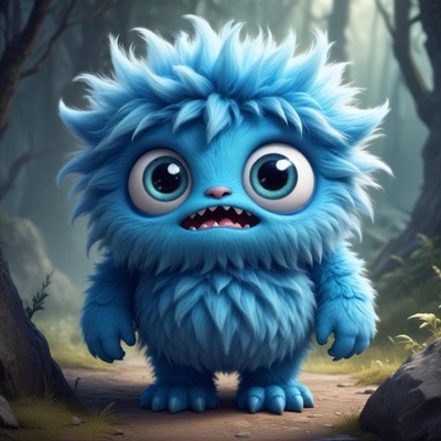 Cute blue creature in a mystical forest setting