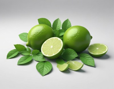Fresh limes and mint leaves arranged on a surface