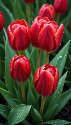 Vibrant red tulips blooming in a garden after rain