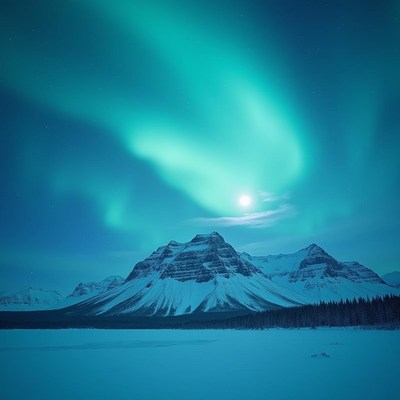 Bright aurora lights over snowy mountain landscape