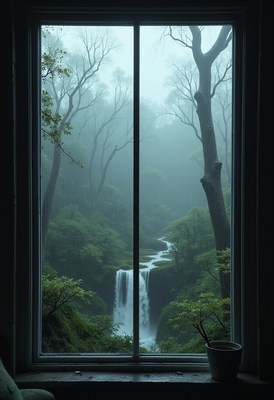 Waterfall view through window in misty forest