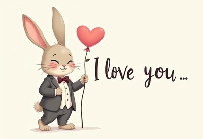 Cute rabbit in tuxedo holds heart balloon for love