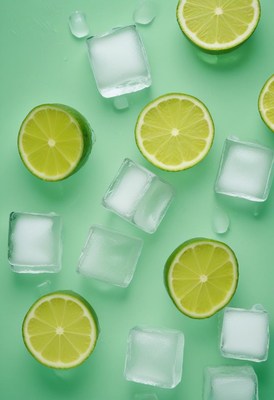 Ice cubes and fresh limes on a vibrant green background