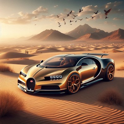 A golden sports car sits in the desert at sunset