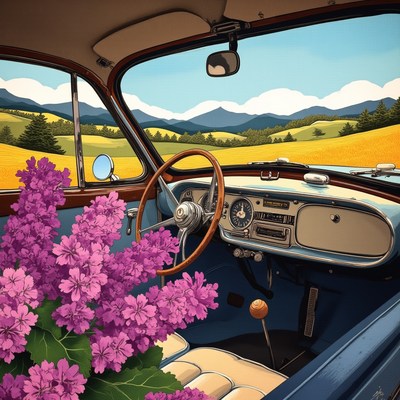 Vintage car interior with flowers and mountain view