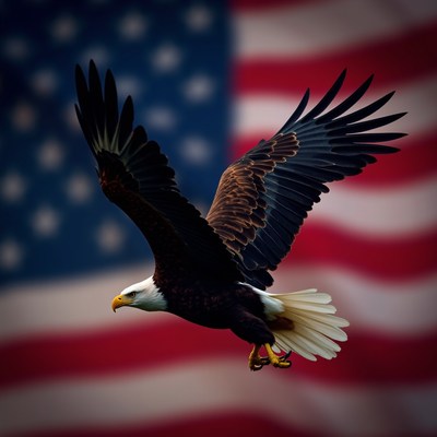 Bald eagle soaring in front of american flag backdrop