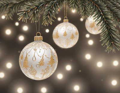 White christmas ornaments hang from a pine branch