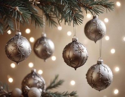 Silver ornaments hang from a pine branch
