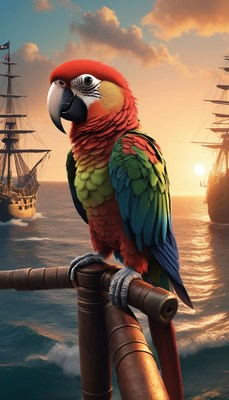 Parrot on ship rail at sunset