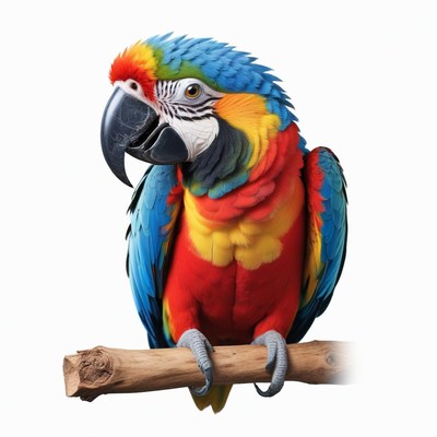 A colorful macaw perches on a branch