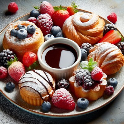 A plate of pastries, berries, and chocolate sauce