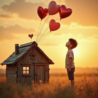 Boy with heart balloons watches sunset by small house