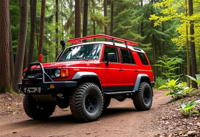 A red suv parked on a dirt road in the forest