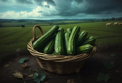 A wicker basket of cucumbers on a dark surface