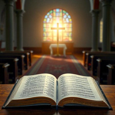 An open bible sits in a church aisle