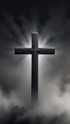 A detailed cross stands in the fog