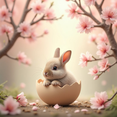 Cute bunny hatching from egg amid blooming cherry blossoms