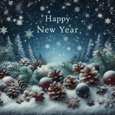 A snowy winter forest scene with pine cones and snowflakes