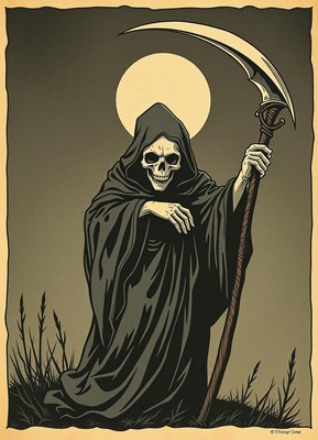 The grim reaper stands in a field at night