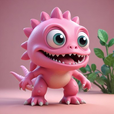 Cute pink cartoon creature on display with foliage