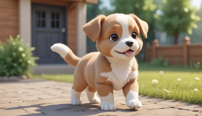 A happy puppy walks on a brick path in the yard