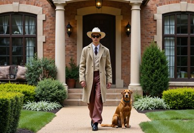 Stylish man in hat walks dog outside elegant home