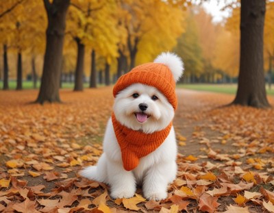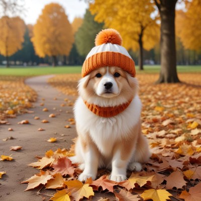 Cute dog wearing a warm hat in autumn park setting