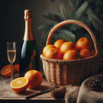A basket of oranges next to a champagne bottle
