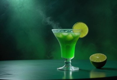 Bright green cocktail with lime slice in a dark setting