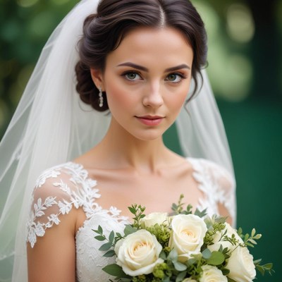A bride in a white dress holds a bouquet of white roses