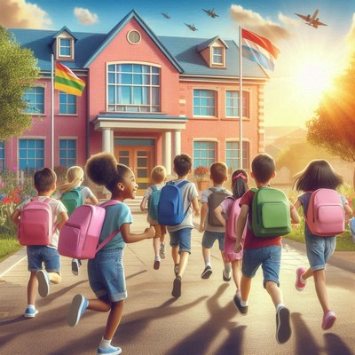 Children running to school in the morning