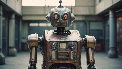 Vintage robot stands in abandoned industrial space