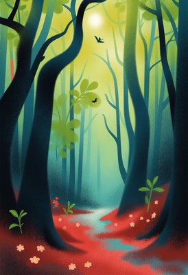 Vibrant forest path with colorful blooms and birds