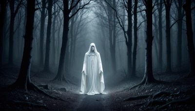 Ghostly figure in foggy forest