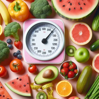 Fresh fruits and vegetables with weighing scale
