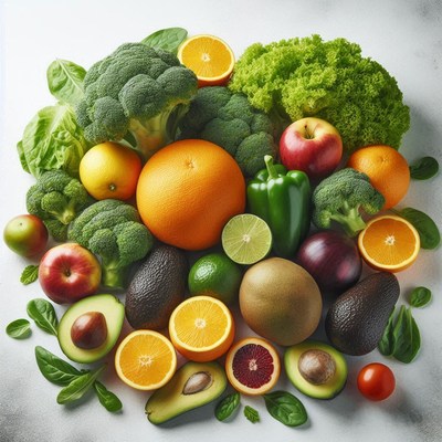 Fresh fruits and vegetables on a white surface
