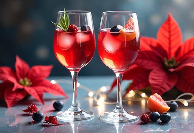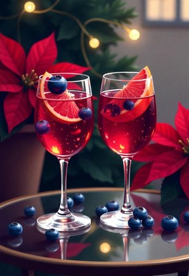 Two glasses of wine with fruit and blueberries on a table