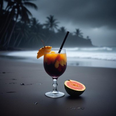 Tropical cocktail on a beach during a moody evening