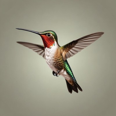A hummingbird hovers in flight against a light background