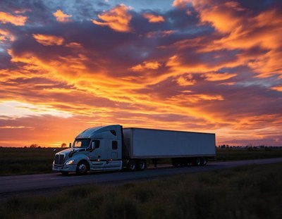 A semi-truck drives down a highway at sunset
