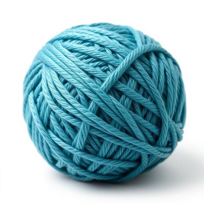 A blue ball of yarn sits on a white surface