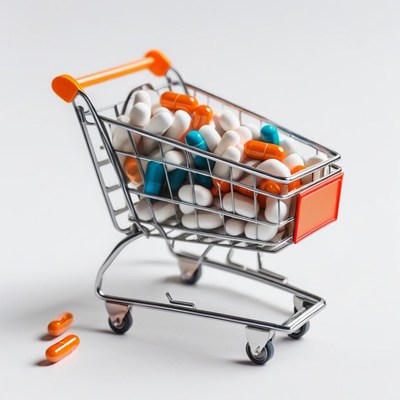 Mini shopping cart filled with colorful pills and capsules
