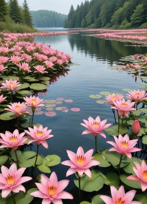 Peaceful lake filled with blooming pink lotus flowers