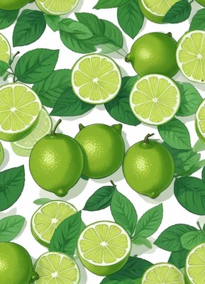 Fresh green limes and leaves arranged on a surface