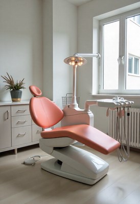 Dental clinic interior with an orange chair and equipment