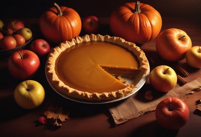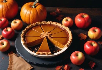 Pumpkin pie missing a slice, near apples and leaves
